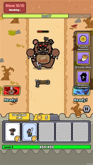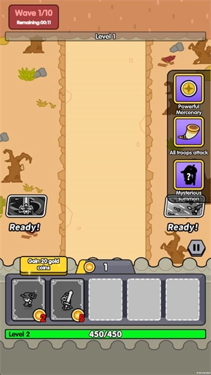 进入关卡后,玩家得召唤小兵对抗敌人,过程中会慢慢获得金币,这些金币可用于召唤小兵。