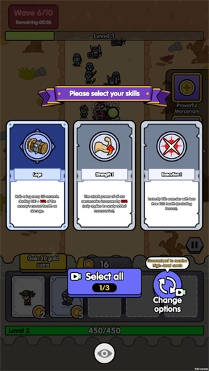 3、召唤各类小兵所需的金币数量各不相同,击败敌人后能够获取经验,等级提升后可挑选一个技能来增强小兵的能力。