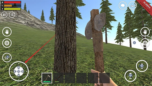 1、进入游戏画面后,点击左侧的方向盘来操控角色移动,让角色靠近需要砍伐的树木。