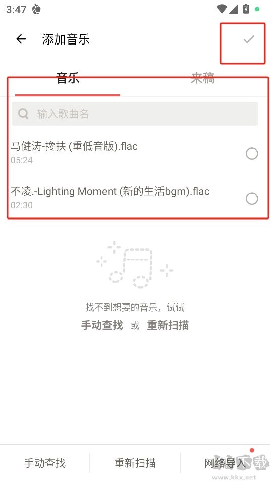 4、在添加音乐功能中,系统提供了多种音乐选择方式。您可以直接搜索查找所需的音乐,找到后勾选对应的选项,再点击右上方的确认按钮即可完成添加。
