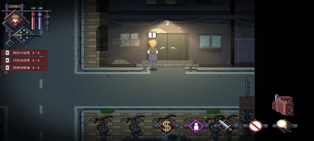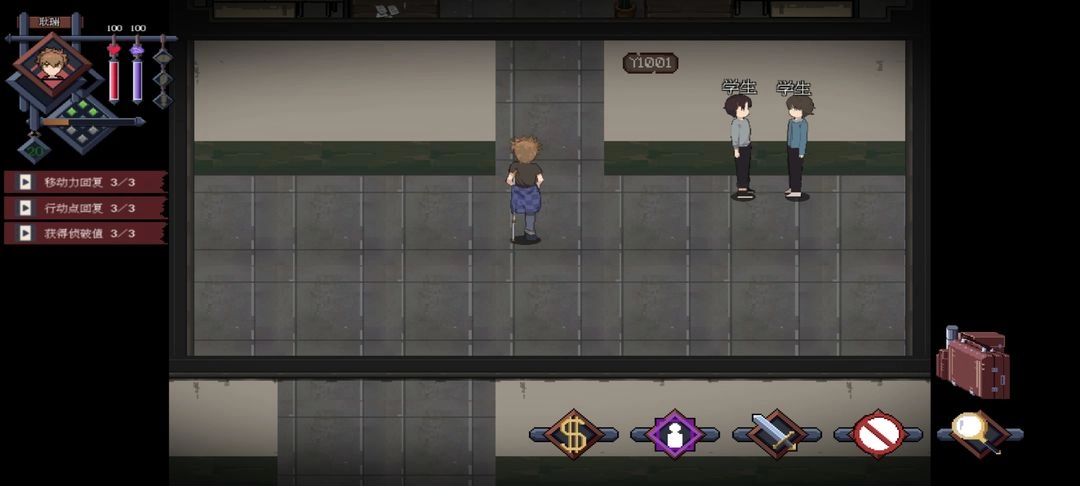 往右上方走是宿舍,在宿舍门前出现感叹号提示的位置,点击右下角的放大镜图标就能进入宿舍了。