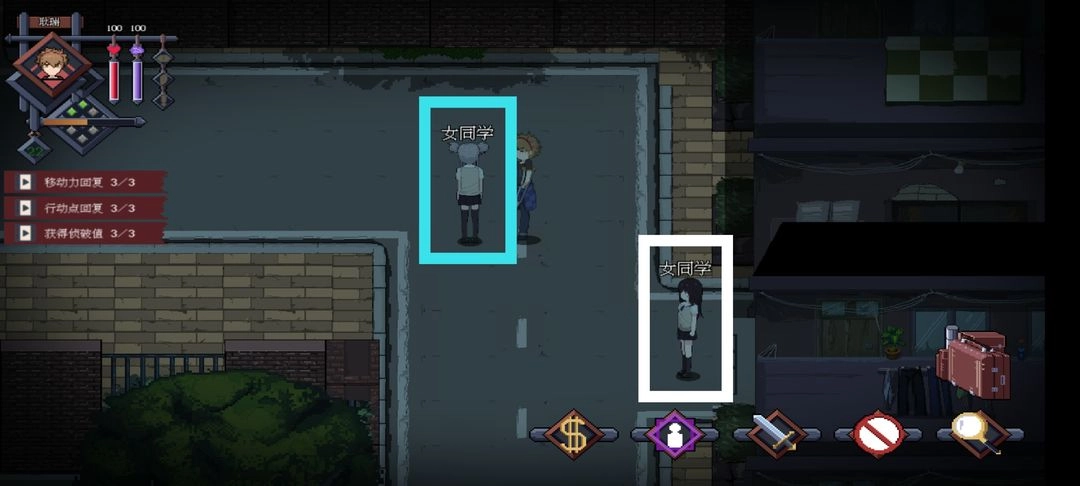 然后回到初始地点,先径直往前走,会看到两个女学生。被白色框标注的那个没什么用,不过被蓝色框标注的那个,在通过社交判定后,能给出一条普通线索和一条思考线索。