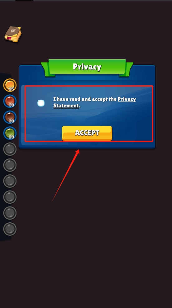 1、点击屏幕下方黄色的ACCEPT按钮以接受隐私协议,左上角的书本图标或许是帮助文档,带有数字的圆圈则表示资源数量。