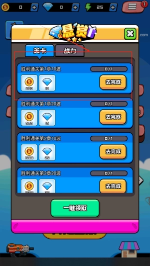 3、在悬赏任务界面中查看关卡挑战内容,完成指定章节的对应波次即可获取金币与钻石奖励,还能一键领取所有已达成任务的奖励。
