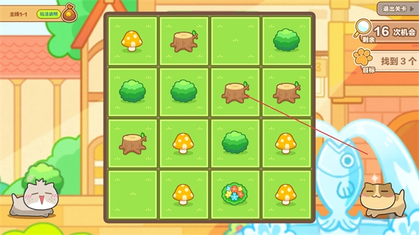 2、在网格场景中,匹配相同物品如树桩,推进关卡进度,完成目标。