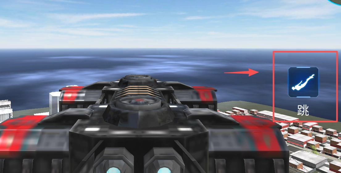 3、在海洋上空飞行器等场景中,点击右侧蓝色方块跳按钮,控制机甲完成跳跃动作,适配战场移动需求。