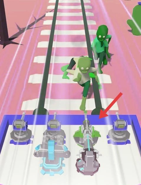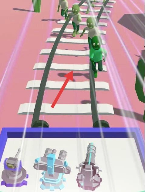 1、进入游戏,面对轨道上的绿色僵尸,选择下方武器如炮台等,持续攻击僵尸,保持前进节奏。