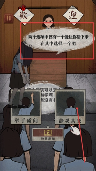 1、面对存活选择时,需谨慎判断选项,选择【静观其变】可避开风险,推进剧情并触发后续关键环节。