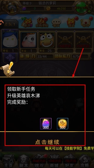 1、新手阶段优先完成升级英雄哀木涕的任务,完成后可获得【300】与【500】的奖励,助力前期资源积累和英雄培养。