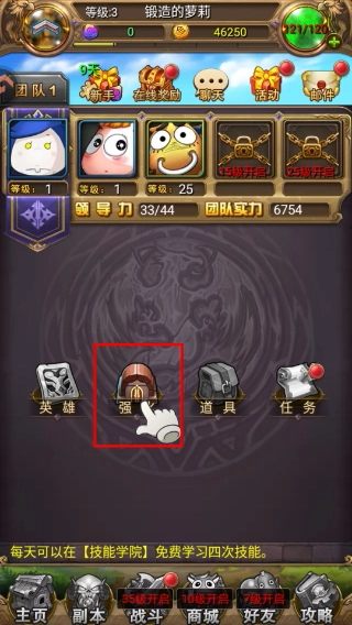 2、主界面中点击【强】按钮,进入英雄培养相关界面,这是提升英雄战力的重要入口,可推进后续养成流程。