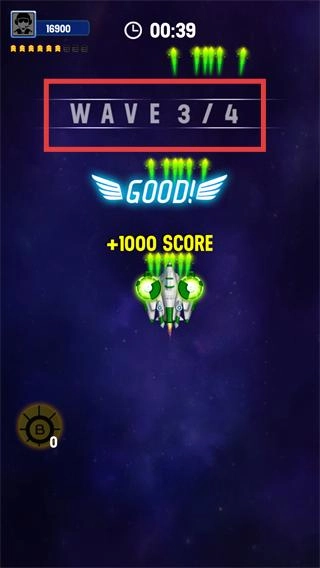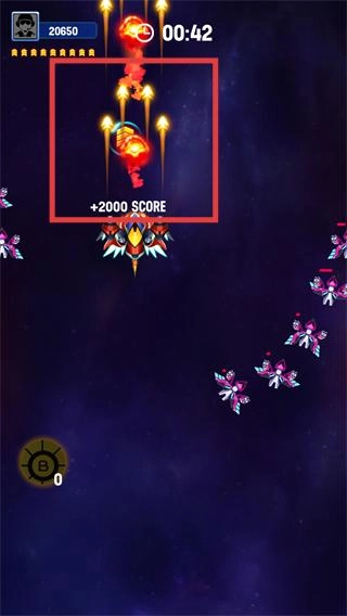 2、开启第三波战斗后,击毁敌方单位可获得【+2000-SCORE】,积分随之更新为【20650】,期间需注意躲避敌方弹幕。
