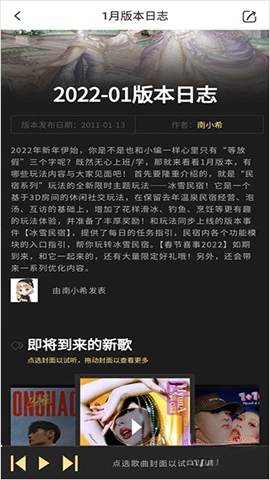 4、点击版本,进入日志页面,您可以最新了解到即将上线的歌曲,并支持试听。