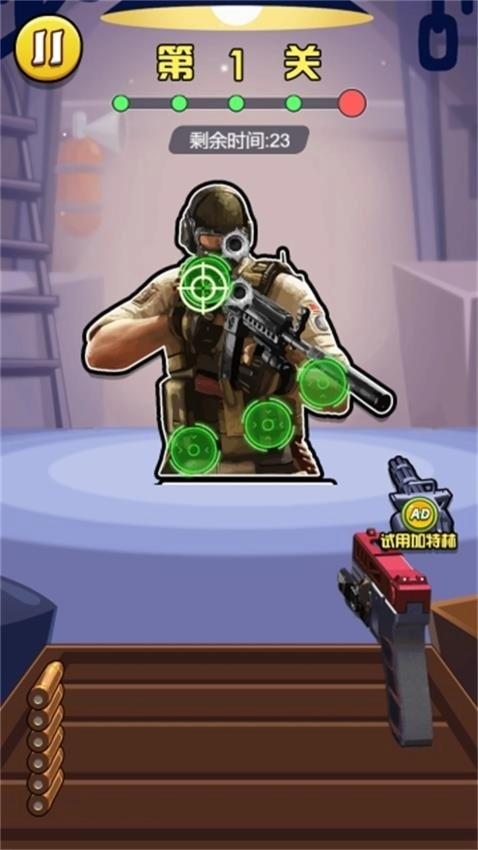 这是一款充满紧张感的射击闯关游戏,玩家需要在众多关卡中迎接挑战。进入游戏后,先熟悉基础规则与场景设定,再着手完成射击任务。随着关卡推进,会不断出现各种随机目标,玩家需要精准击落它们——一旦瞄准出现偏差,就会错失得分机会,最终导致关卡失败。因此,整个游戏过程中,玩家都必须全神贯注地观察目标位置以及突然出现的物体,同时还要依据任务的具体要求,选择合适的位置进行瞄准,有些任务甚至对射击位置有明确规定。 此外,玩家还需时刻留意枪支的改造与强化系统。通过简单的升级操作,就能显著提升枪支的整体性能,这将帮助玩家更轻松地应对各种难题,顺利完成最终挑战。如果你对这类游戏感兴趣,不妨来尝试一下,相信会感受到它极强的趣味性。