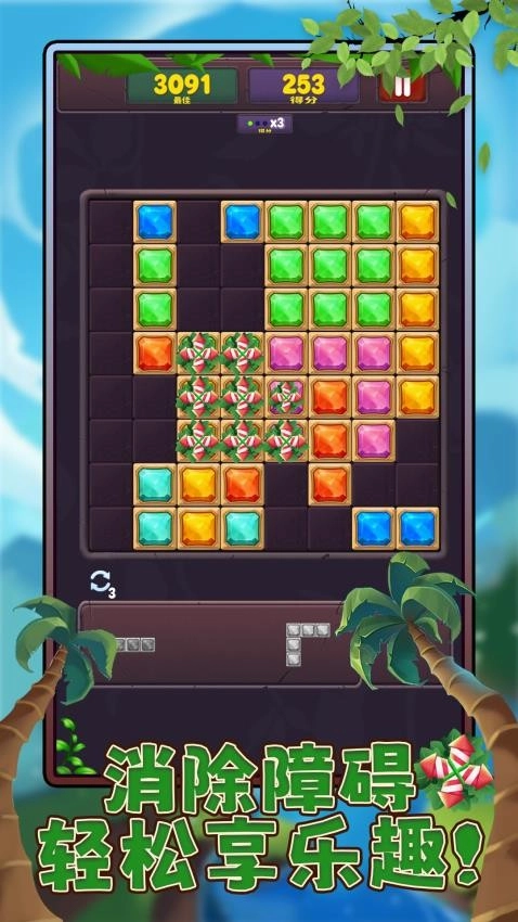 这是一款以消除方块为核心玩法的休闲益智游戏,趣味性十足。玩家只需通过单指操作,就能控制方块的移动、消除,从而推进关卡。游戏中,方块和宝石的位置需要仔细观察,随着位置的变化,挑战难度和趣味性也会随之提升。在拼凑方块的过程中,玩家能够充分放松身心,缓解压力,游戏设计不会过于复杂,适合各类玩家沉浸其中,体验多方面的挑战与乐趣。玩家需要在游戏过程中合理规划,快速达成各个目标。此外,游戏提供了多种道具供玩家选择和使用,每种道具都有其独特的效果。根据当前的游戏局面和分数情况,选择合适的道具使用,可以显著提高闯关的效率和成功率,这一点非常重要。