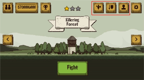 点击界面中央的战斗按钮就能启动游戏,顶部从左至右排列着训练模块、装备栏与角色选项。