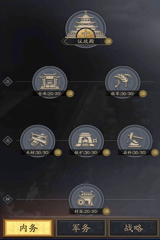 城池的内政系统如同一个庞大的修炼体系,主公消耗石料、木材、铁矿等资源进行升级,就能全方位综合提升国土实力,玩家可依据自身玩法节奏,灵活选择内政中子系统的升级顺序。