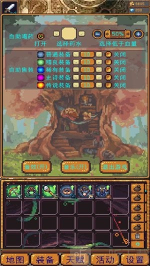 3.药水下方设有自动出售功能,需先开启并设定等级才会生效,比如设定10级的话,就只会自动出售10级及以下的装备,等级更高的不会被卖掉。前期只要捡够自己能穿的装备,就可以把白色、绿色、蓝色品质的装备直接将等级上限拉到100级来出售,毕竟这三种品质的装备属性不如紫色的好。