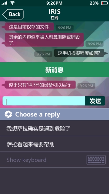 3、接着点击Iris(这是个手机助手,是不是siri反过来的拼写呀),和它进行对话,任意选择选项就行,它会发送给你一段萨拉的视频,不用担心,视频是无毒无害的,可以放心观看。和Iris聊上一会儿之后,它会请求你帮忙找萨拉,这时候选择yes就可以了。(要是选no的话,它会继续向你请求的)