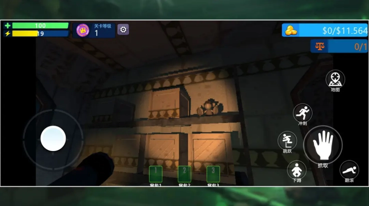 5、右侧按键区域设有“下蹲”“跳跃”等交互功能键,通过长按或点击操作可触发相应动作。