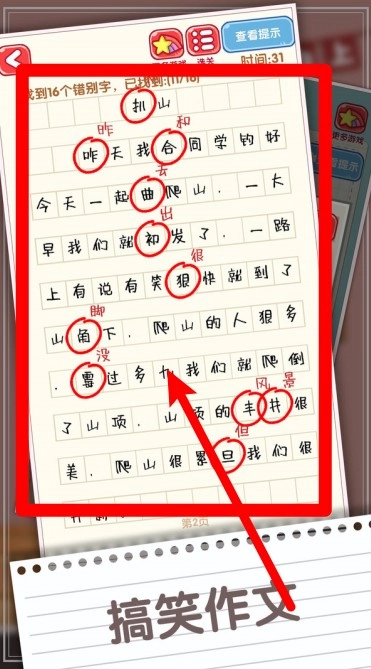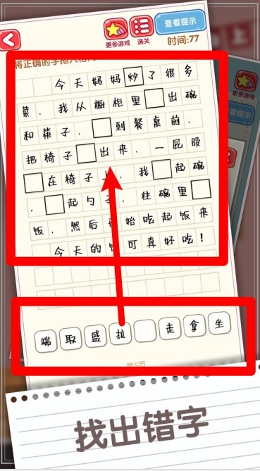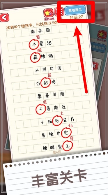 1. 点击“查看提示”按钮,获取线索辅助,助力快速找出剩余错字。