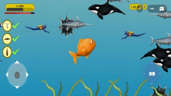 1. 玩家在游戏里要操控一条起初被困在鱼缸中的小鱼,通过持续进食完成进化,最终成功征服海洋。