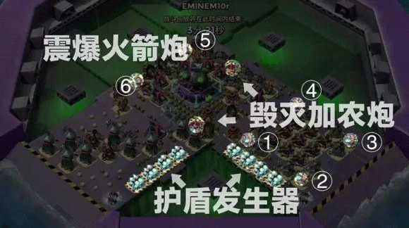 要处理护盾发生器,就得先压制住大本周边的毁灭加农炮与震爆火箭炮。不过需要震击的点位太多会导致能量不足,所以阿姆决定采用震撼铁拳来节约能量。