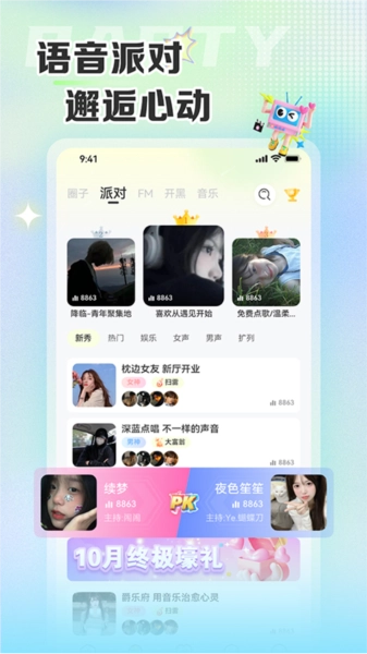 支持派对交友功能,用户能够自由加入各类派对,开展多人聊天与互动交友活动。