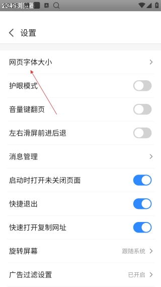3、进入设置页面后,找到并点击【网页字体大小】选项,即可进入字体大小的调整界面。