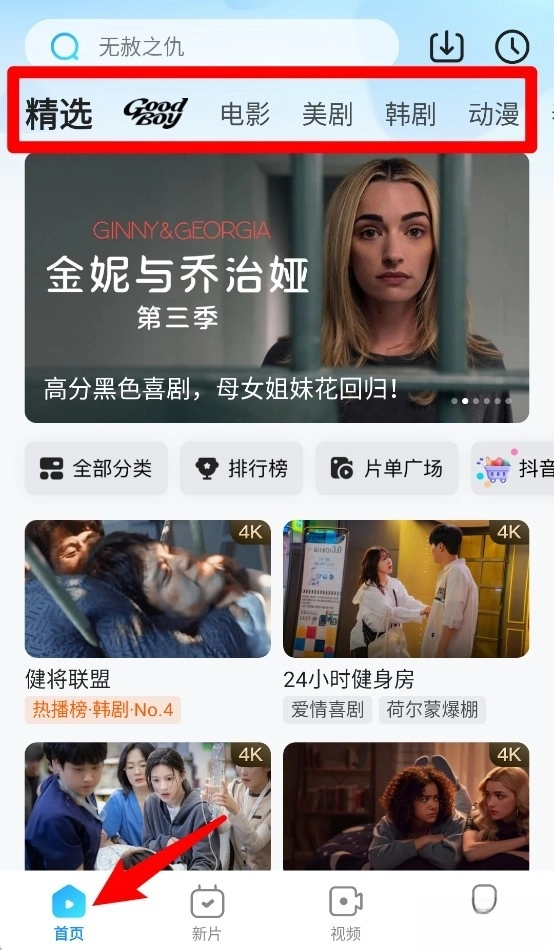 1、点击首页选项,能浏览推荐的影视内容,还可借助顶部标签快速切换电影、美剧、韩剧、动漫等各类不同分类。