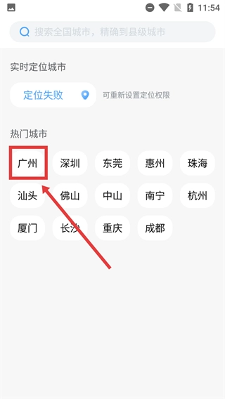 2、在城市选择页面,你可以通过搜索功能查找,或者直接选择热门城市(比如示例里的【广州】),确定好目标城市后,就能查看该地区对应的天气情况了。