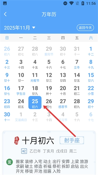 4、进入万年历页面后,能够查看当前日期、农历信息、所属星座以及当天适宜办理的事项等内容,还可以通过切换月份来查看不同时间段的日期详细信息。