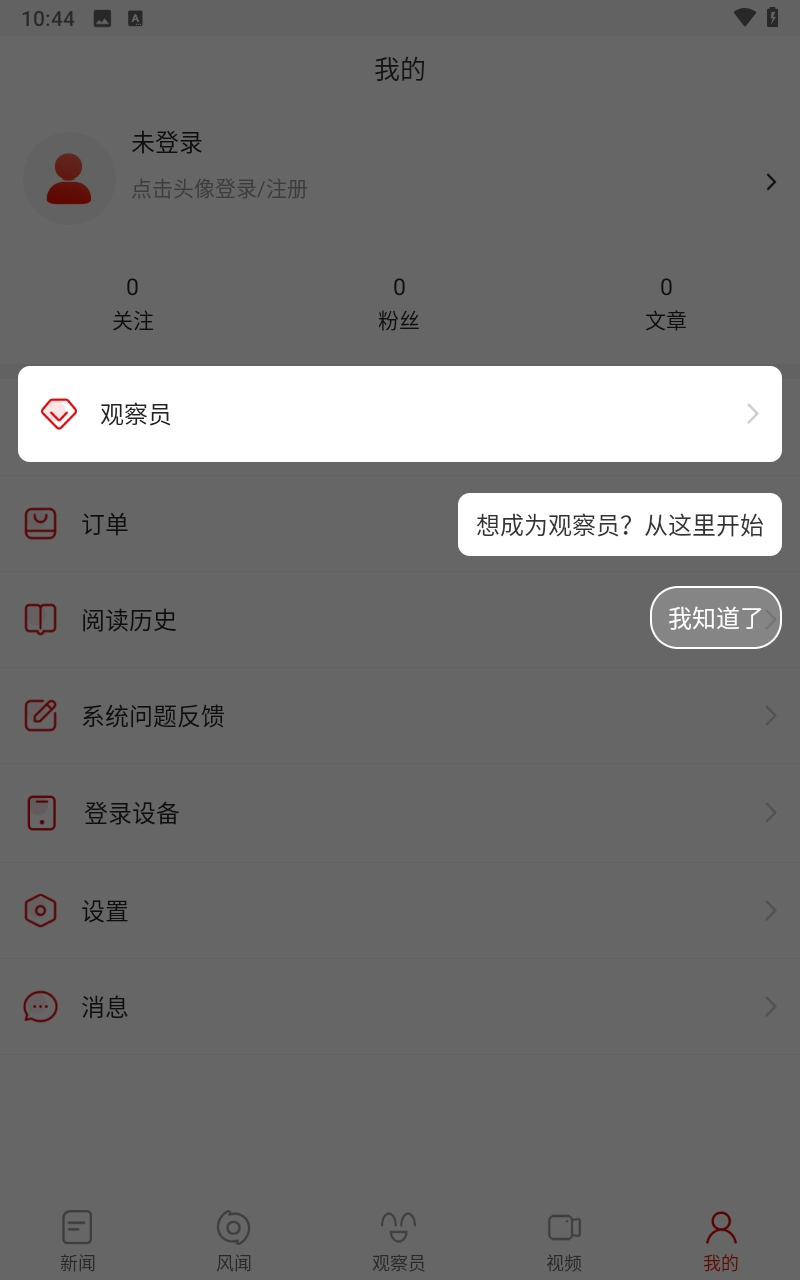 5、【我的】页面设有观察员、订单、阅读历史等功能板块,过往的浏览记录可随时在此查看。