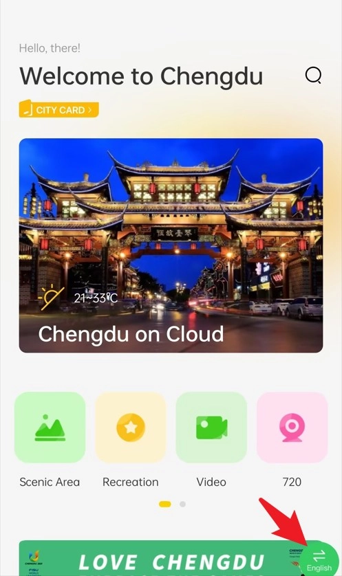 3、英文界面切换功能设置在底部,便于国际游客快速获取成都文旅相关资讯。