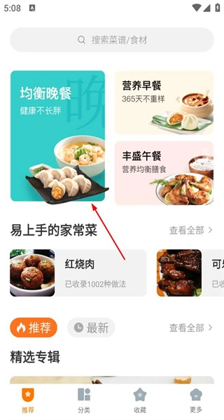 打开软件进入首页后,能看到“均衡晚餐”“营养早餐”等板块,点击“均衡晚餐”板块,即可进入晚餐菜品列表页面。
