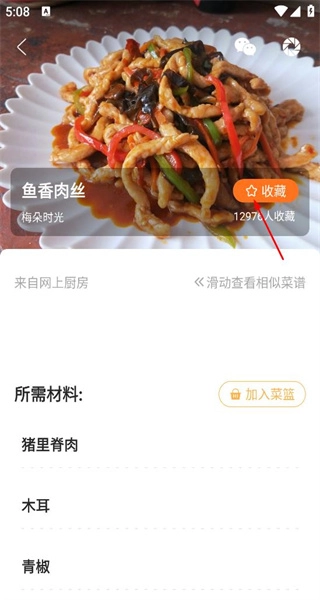 3、进入鱼香肉丝的详情页,能看到菜品的实物图片,点击即可完成收藏操作;页面下方会展示这道菜所需的原材料,像猪里脊肉、木耳、青椒等都包含在内。