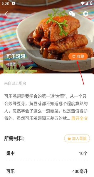4、调出晚餐的菜品清单后,点击可乐鸡翅这一项进入详情页,能看到菜品图片与收藏按钮,页面下方还列出了翅中、可乐等所需食材。