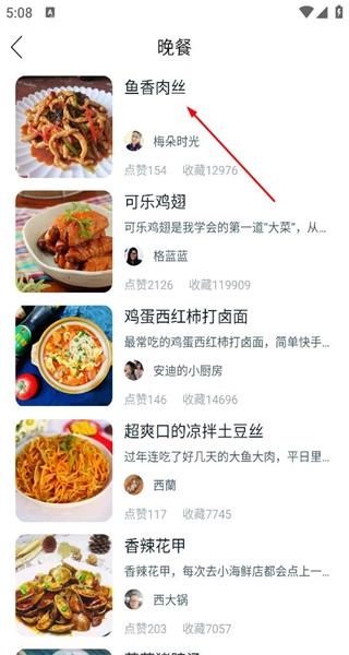 2、进入晚餐菜品列表页面后,能看到鱼香肉丝、可乐鸡翅等菜品,点击鱼香肉丝,即可进入该菜品的详细做法与材料展示页面。