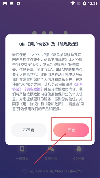 1、打开【Uki】后,要先阅读【《用户协议》-《隐私政策》】,勾选已阅读选项并点击【同意】按钮,方可进行后续操作。