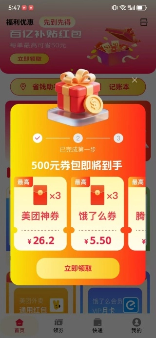 登录后进入首页,即可参与红包领取活动,从而获得首单立减的优惠。