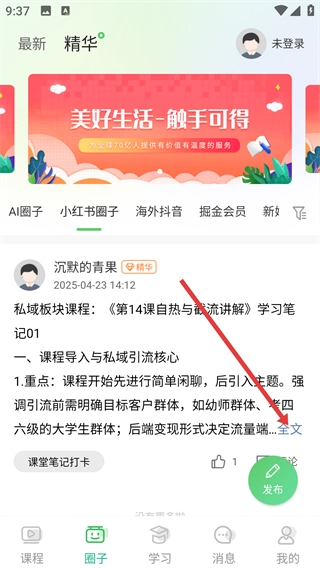 在课程页面中,点击底部的【圈子】按钮,就能进入圈子板块,浏览各类圈子的内容。