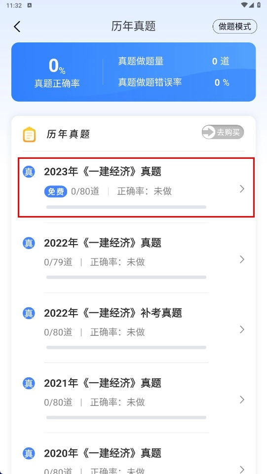 1、点击【历年真题】功能按钮,即可进入历年真题页面。