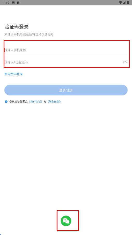 3、支持验证码登录方式,可输入手机号码与验证码完成登录;也可点击微信图标进行登录。