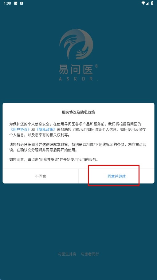 1、在服务协议与隐私政策弹窗中,点击【同意并继续】功能按钮。