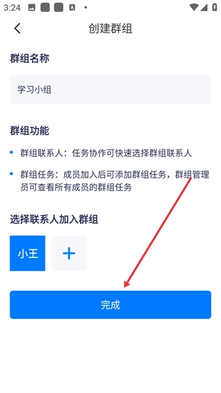 4、返回创建群组的界面,点击【完成】按钮,即可完成群组的创建操作。