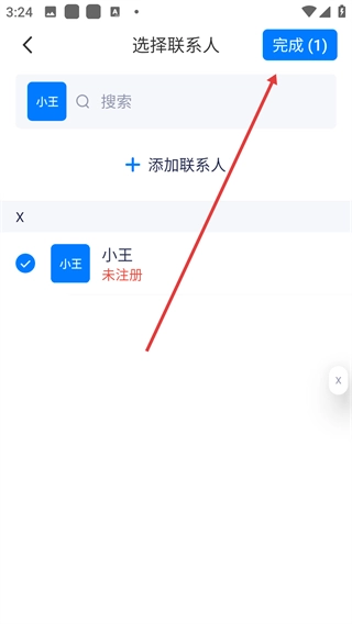 3、在联系人选择界面中选中目标联系人(例如“小王”),随后点击【完成】按钮。