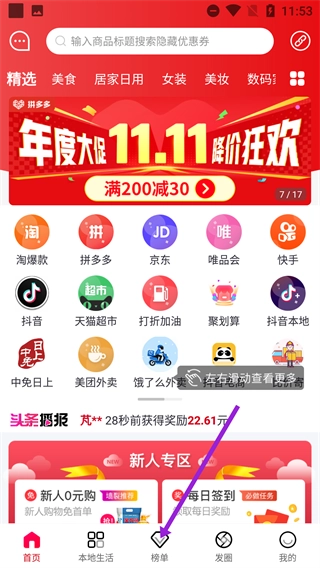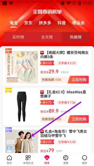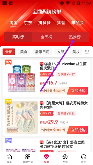 1、在首页底部找到并点击【榜单】按钮,进入全网热销榜单页面,即可开始浏览商品榜单。