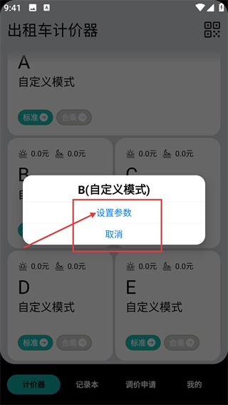 在出租车计价器的计价器页面,能够选择B、C、D、E等自定义模式,每个模式均提供标准、合乘两种计价方式供选择。