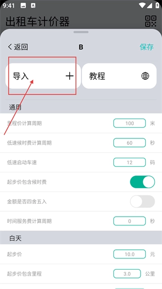 3、进入模式B的参数设置页面后,点击【导入+】按钮,既可以导入相关参数,也能查看对应的教程,另外还能对里程、时间、起步价等计价参数进行设置。