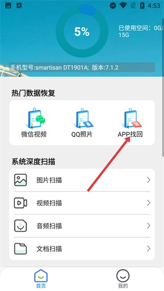 1、打开软件首页,点击【找回】功能入口,进入丢失列表页面后,就能查看已卸载的内容了。
