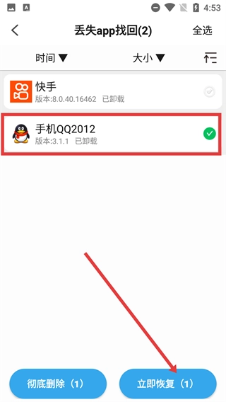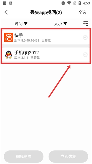 2、在丢失列表里,找到那些可以找回的项目,像【快手】【手机QQ2012】这类,然后挑选出你想要恢复的。